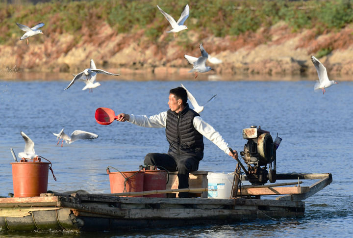 2025年12月10日,福建省漳州市佛昙镇东坂村河豚养殖户在给河豚投喂食物。(新华社记者 魏培全/摄)