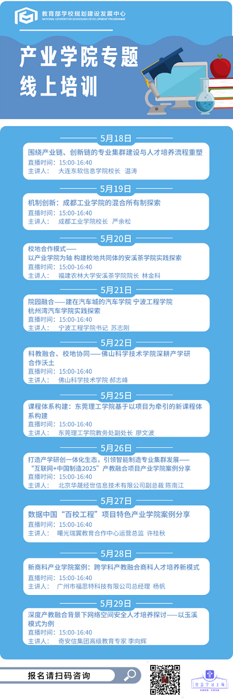 本次专题系列研修为期两周,从5月18日开始,至5月29日截止。专题研修通过丰富的实践案例,从人才供给端和需求端的双元视角挖掘产业学院的创新路径,探索产业学院现实困境的消解之径。此外,本次专题系列研修还将引入线上工作坊,围绕听课过程中广泛关注的共性问题,深入剖析研讨,提升研讨质量,丰富研修内涵。更多专家讲座精彩内容,欢迎关注“教育之弦”微信公众号!